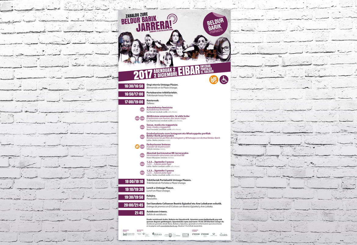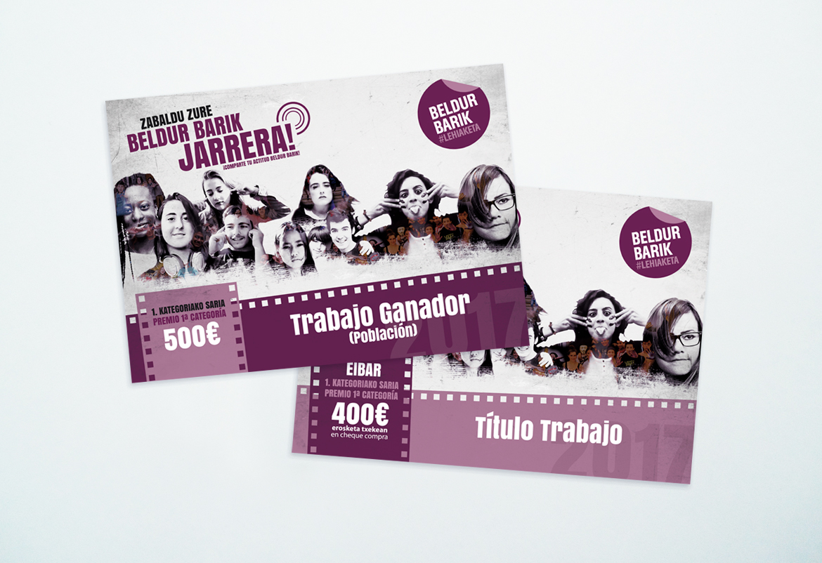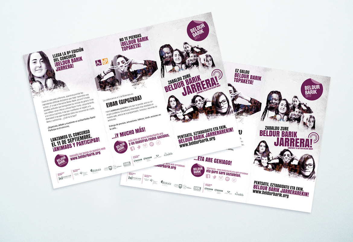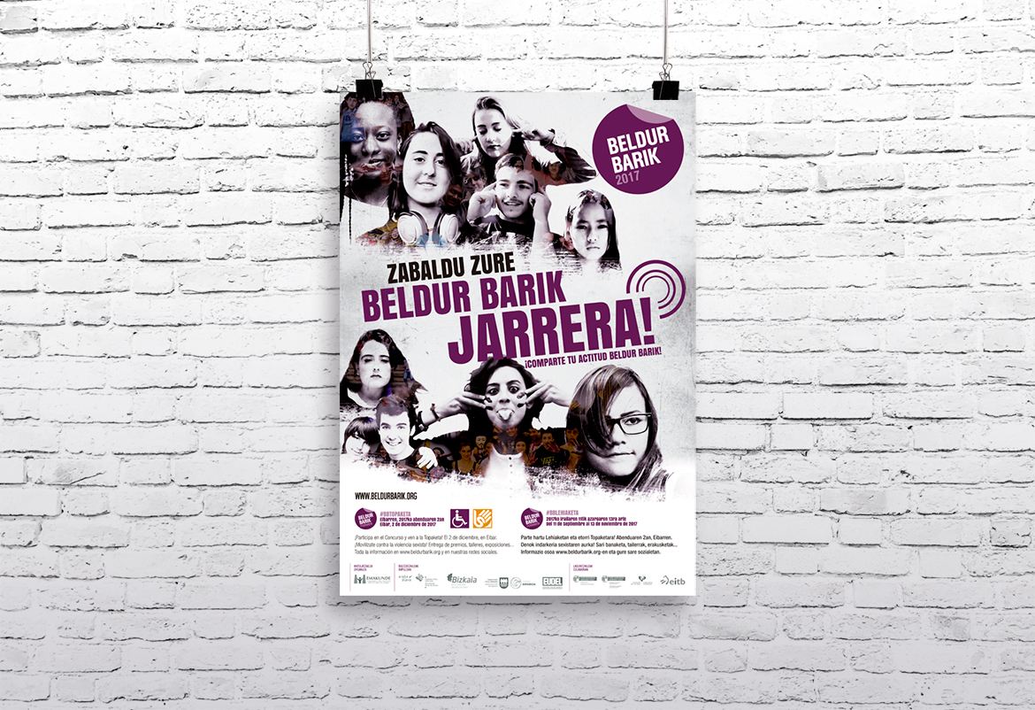 Diseño completo de piezas para campaña Beldur Barik 2017. Beldur Barik es un programa anual de prevención de la violencia sexista con jóvenes organizado por Emakunde y que cuenta con el apoyo de las Diputaciones Forales de Araba, Bizkaia y Gipuzkoa, y EUDEL, además de contar con la colaboración de otras instituciones públicas.