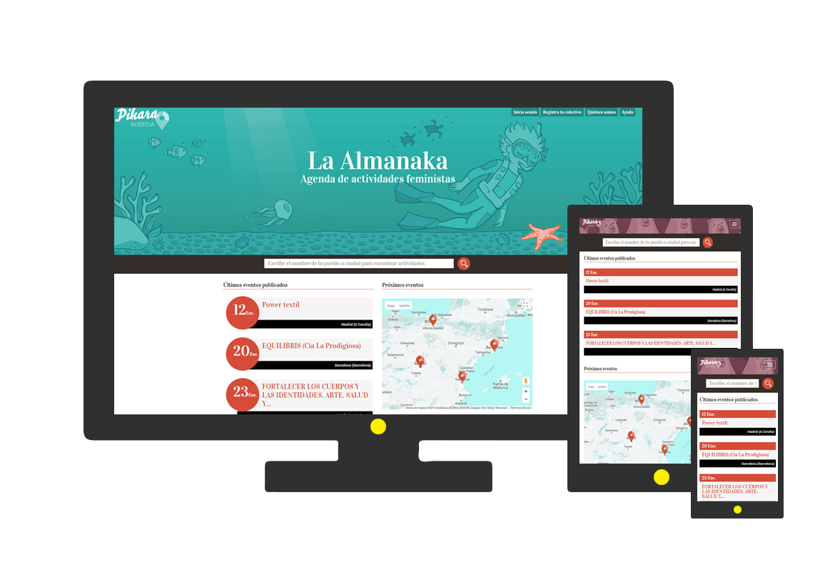 Diseño y programación de la página web La Almanaka, una agenda de actividades feministas creada por Pikara Magazine. Registro de asociaciones, mapa con ubicación exacta de actividades, zona de administración, agenda y buscador. Visitar página